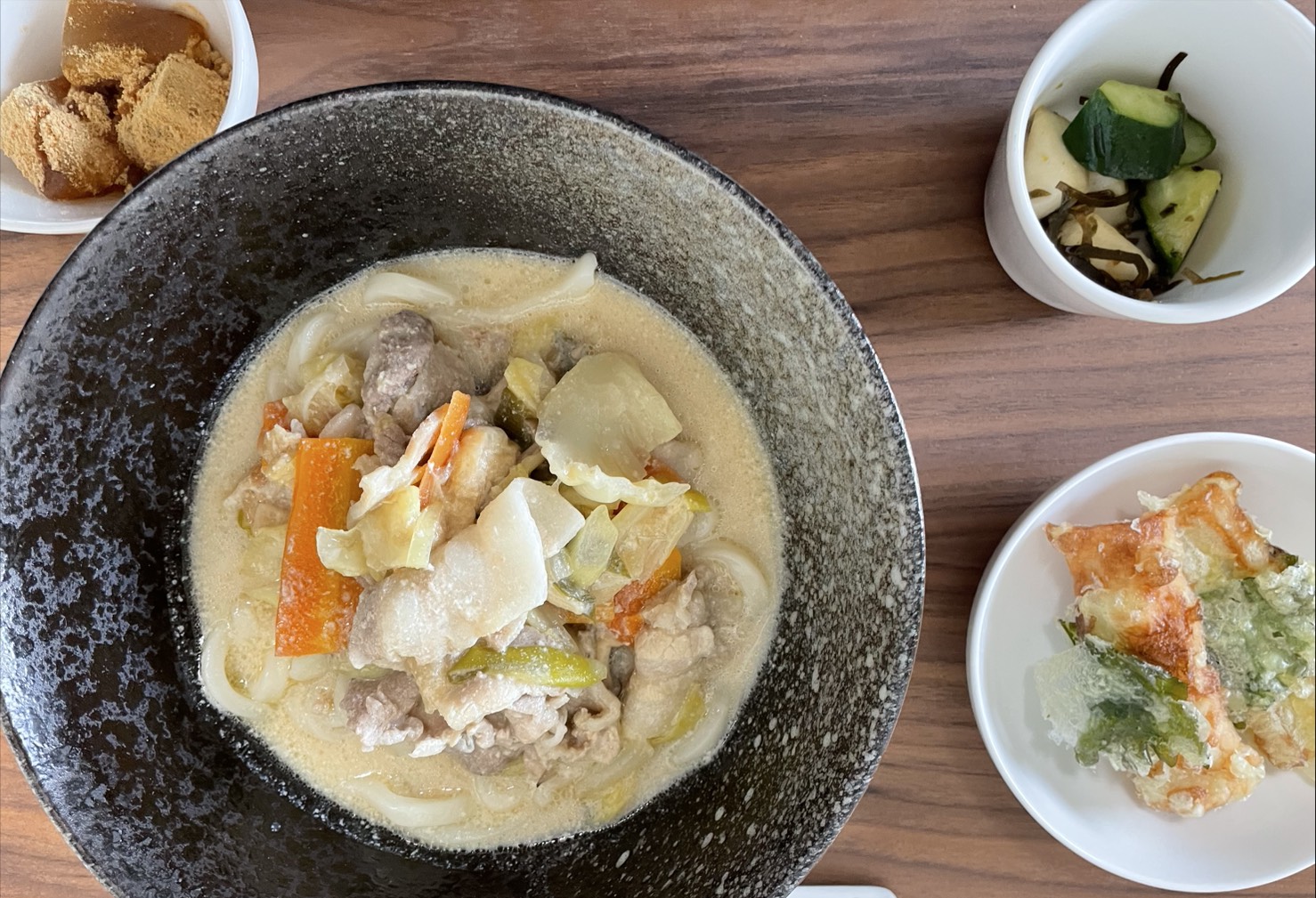 かつおだしが香る、濃厚な豆乳とみそのスープにうどんがよく沁みますね☺✨
