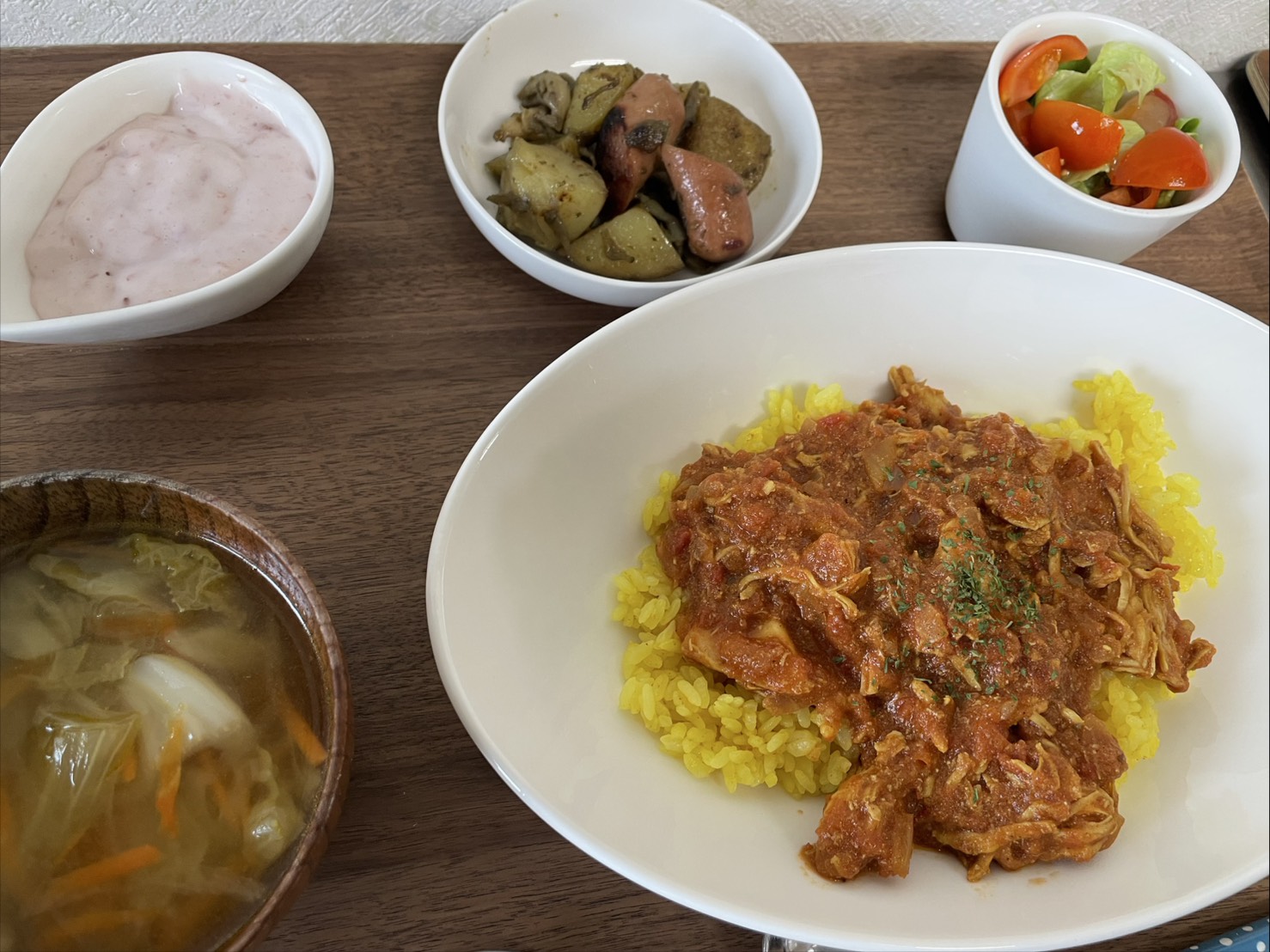 鶏むねを焼きながらほぐし、トマト缶とたまねぎとたくさんのスパイスを入れて
